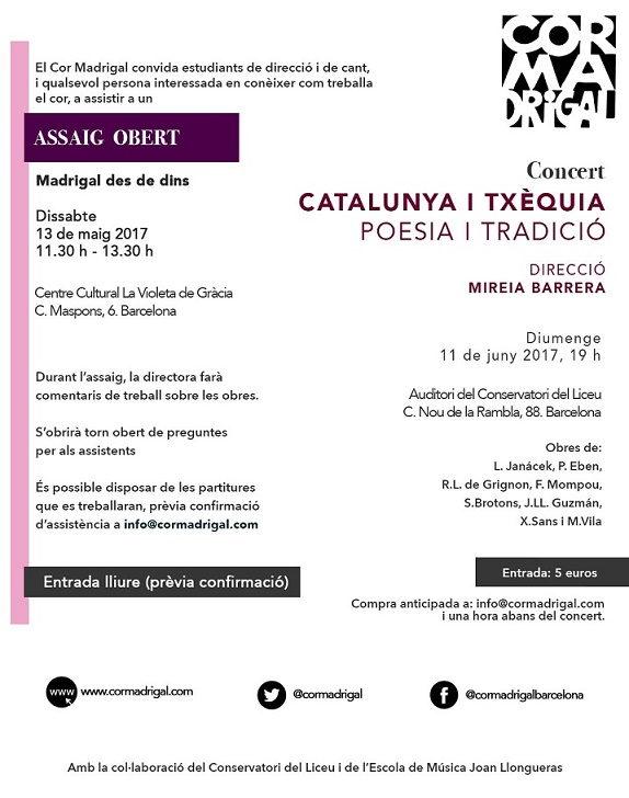 Us convidem a: · Assaig obert, dissabte 13 de maig, 11.30 a 13.30h · Entrada lliure, prèvia confirmació a info@cormadrigal.com · Concert “Catalunya i Txèquia, poesia i tradició”, diumenge 11 de juny, 19h · Entrada 5€, el mateix dia del concert o anticipadament a info@cormadrigal.comCor Madrigal de Barcelona. Si voleu contactar amb nosaltres aneu a Contacte.